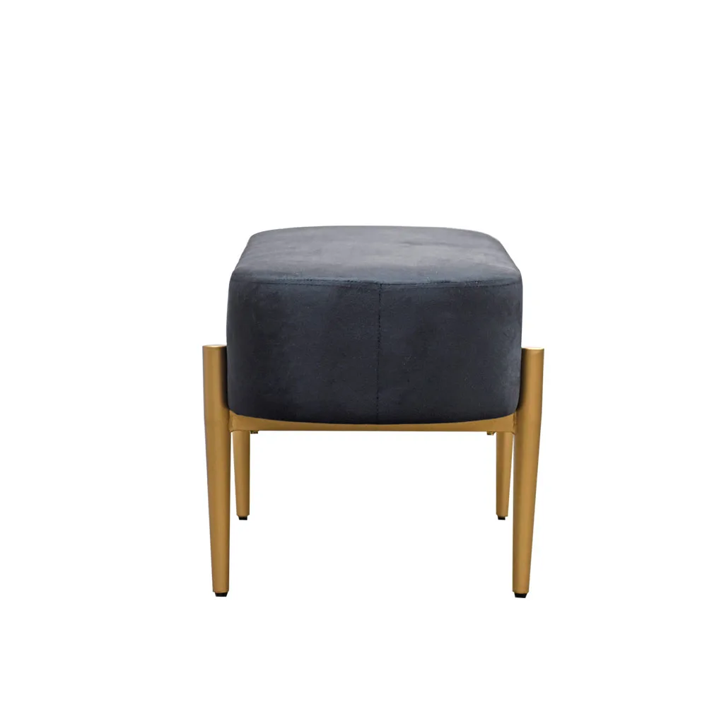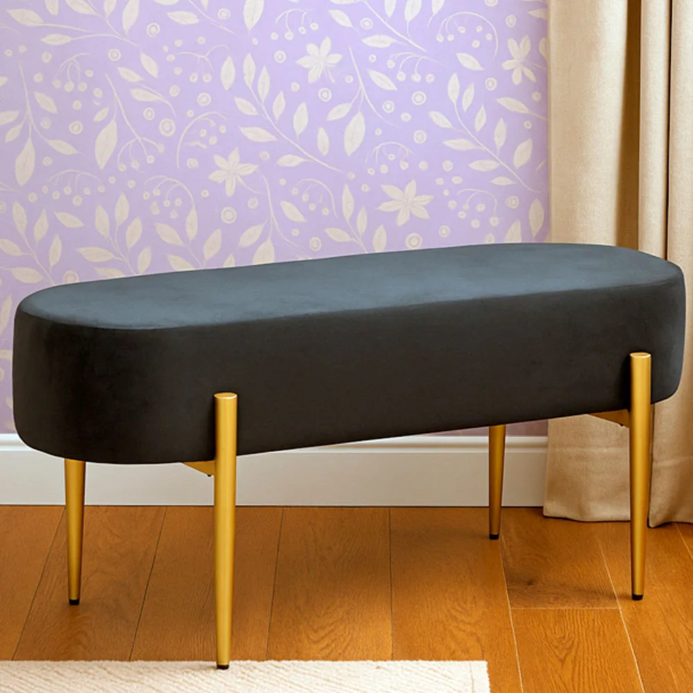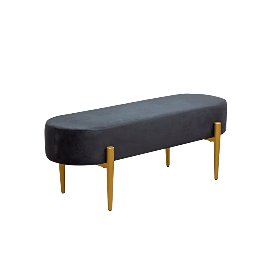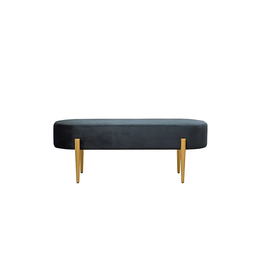 Banqueta Black Drag de diseño contemporáneo, ideal para complementar espacios como recibidores, dormitorios, clósets o zonas de estar elegantes. Sus características principales son: Asiento tapizado en terciopelo o tela de textura aterciopelada en color negro, que aporta sofisticación y confort. Forma ovalada con esquinas redondeadas, lo que suaviza su presencia visual y la hace segura para hogares con niños. Cuatro patas metálicas delgadas en acabado dorado mate, que contrastan con el tapiz oscuro y brindan un aire moderno. Estructura compacta pero robusta, con soporte metálico integrado. Combina perfectamente con interiores de estilo moderno, glam, art déco o minimalista con acentos metálicos, hacen que sea fácilmente combinable con otros elementos decorativos.