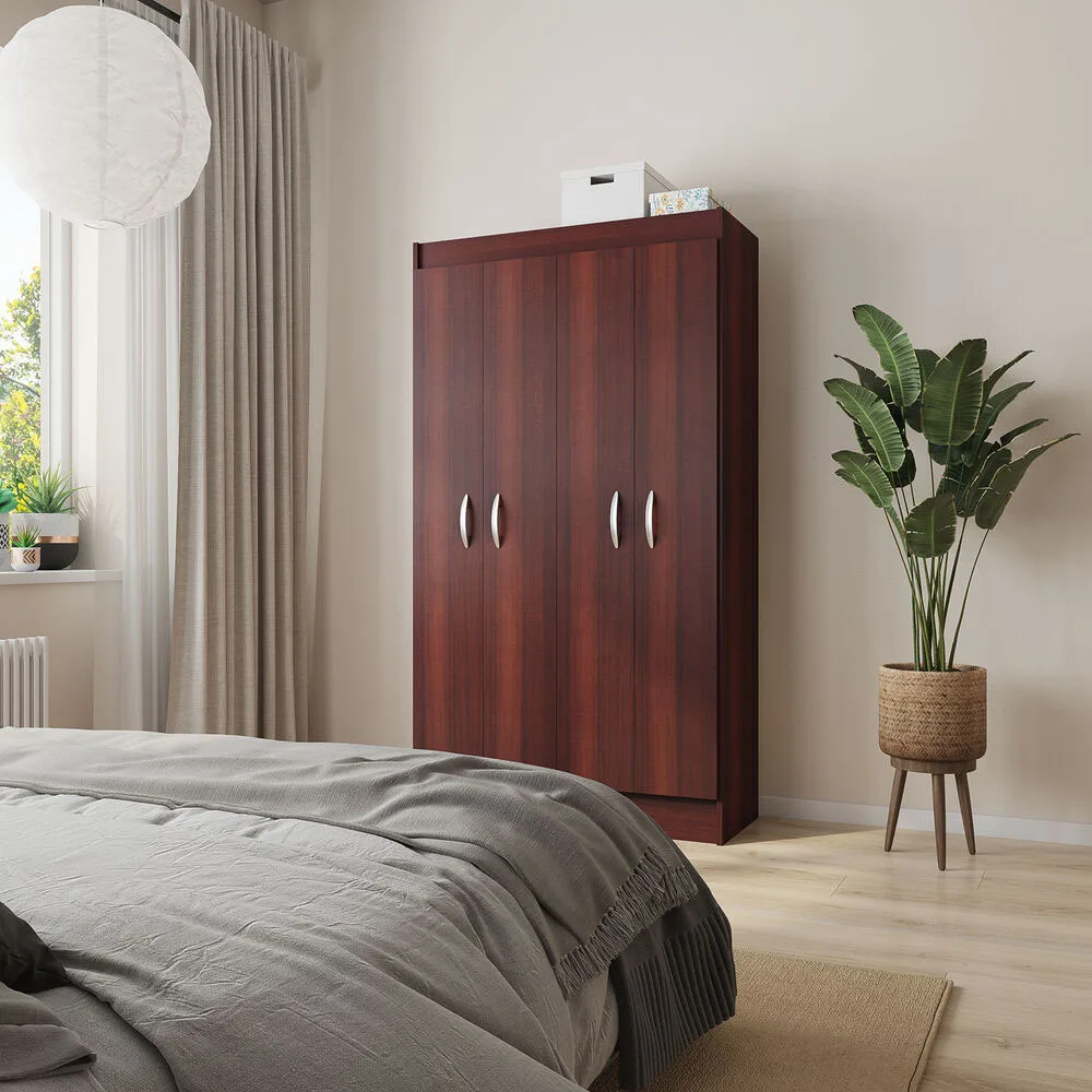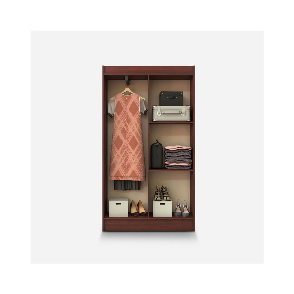 El clóset Bagua wengue es ideal para quienes desean una opción de almacenaje amplia y con un estilo sobrio. Sus 4 puertas ocultan una estructura interior bien pensada con repisas y barra colgadora, permitiendo mantener todo en orden de forma práctica.