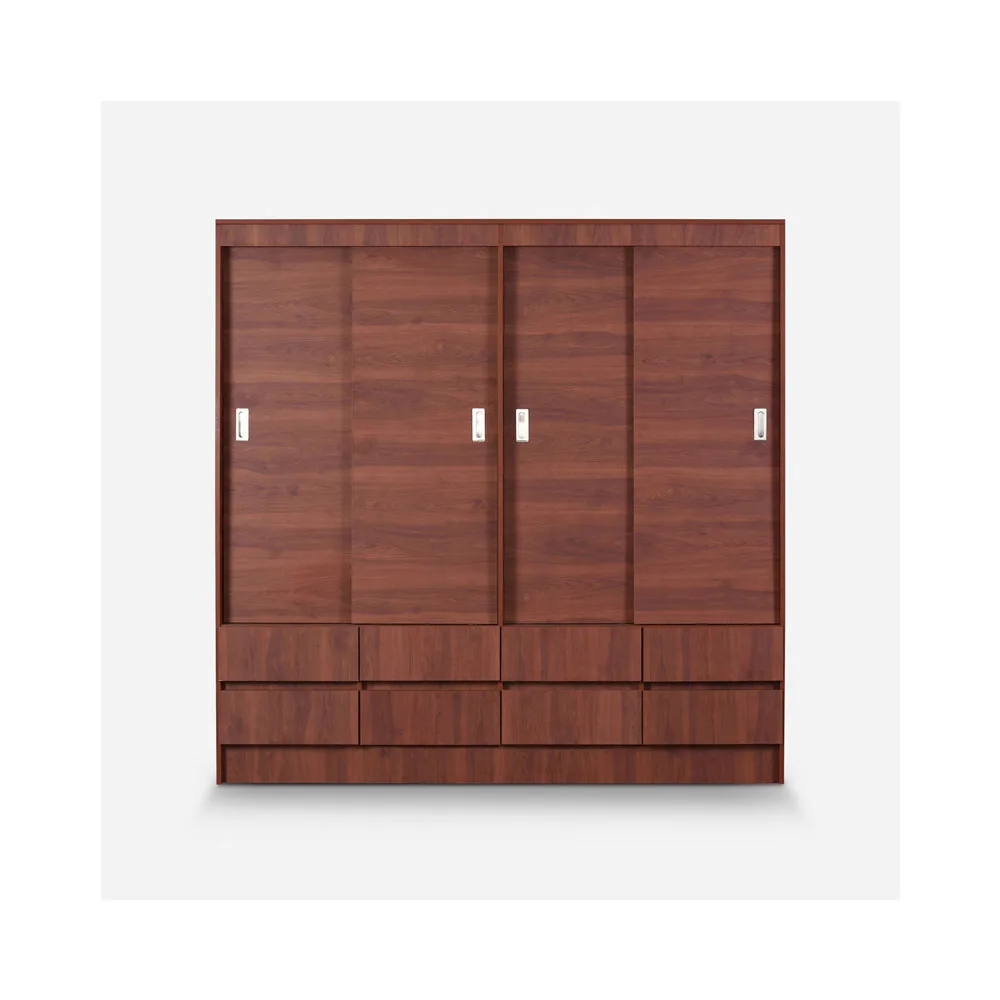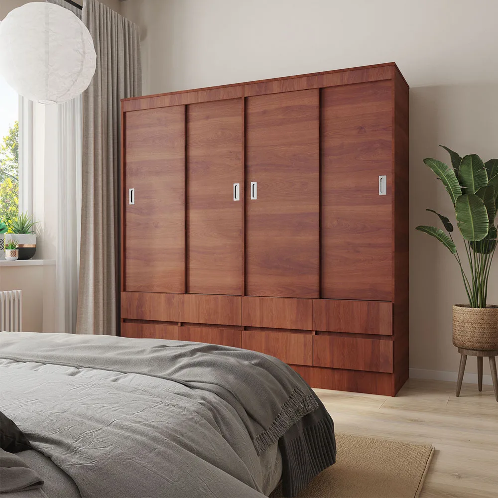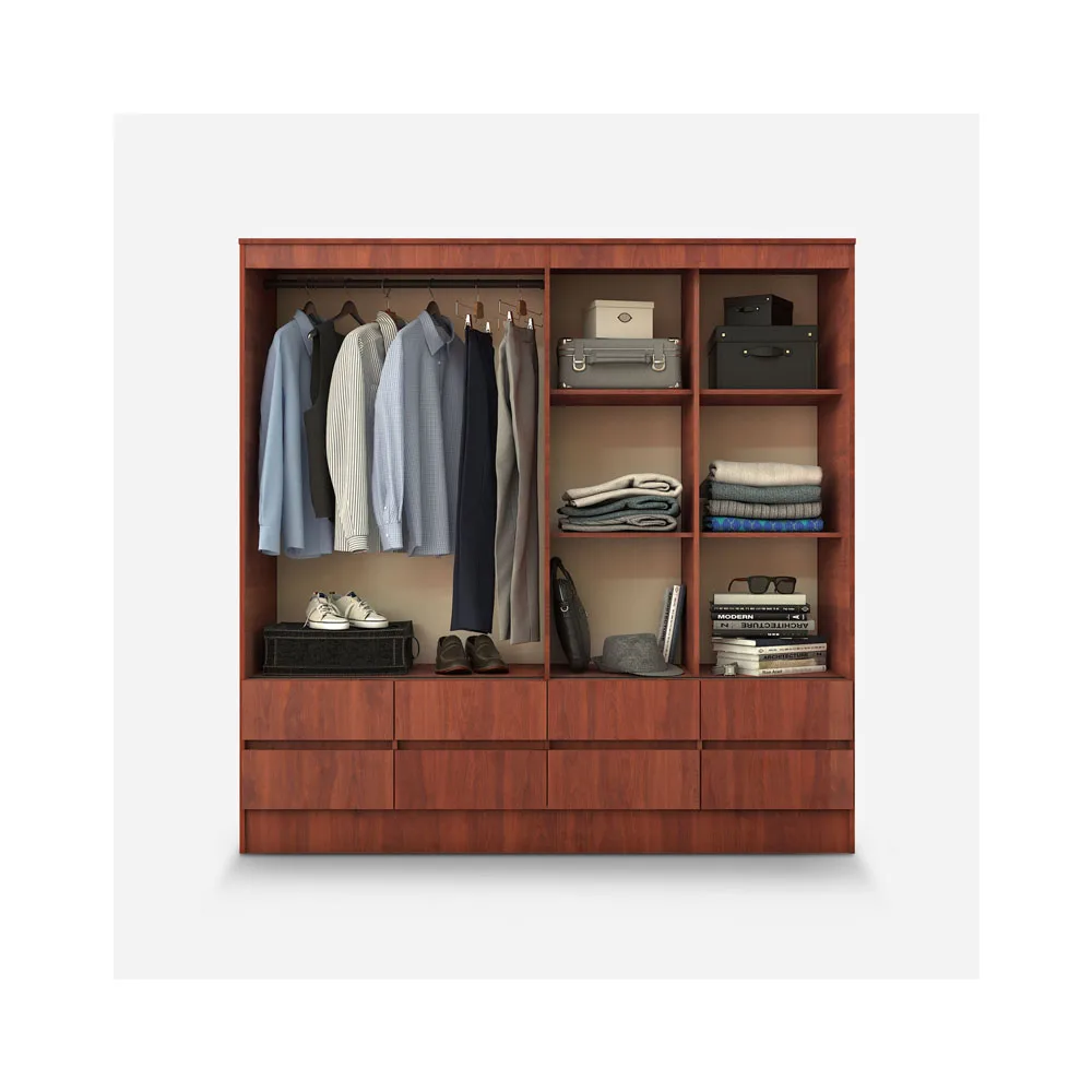 Con una estética cálida y acogedora, el clóset Maule cerezo es ideal para quienes necesitan una solución de almacenamiento de alto volumen. Sus 8 cajones y 4 puertas permiten separar prendas por categoría, facilitando la rutina diaria con estilo y eficiencia.