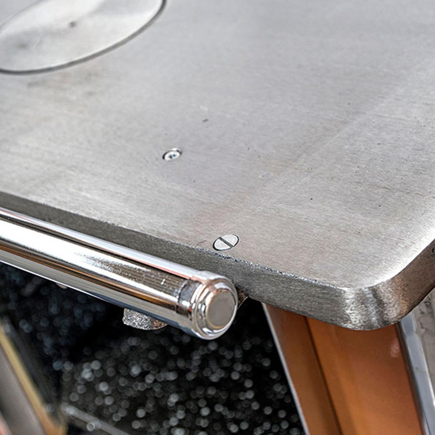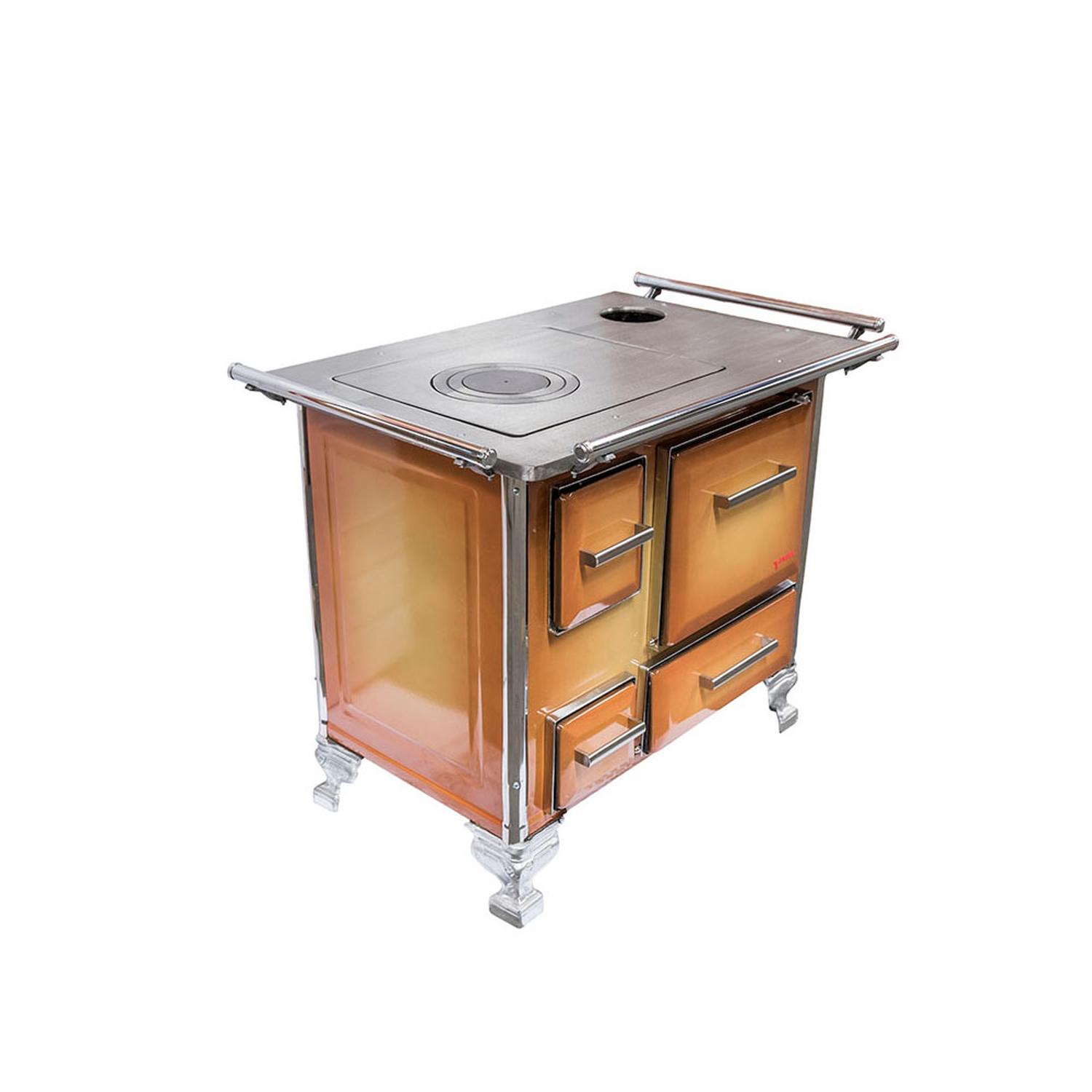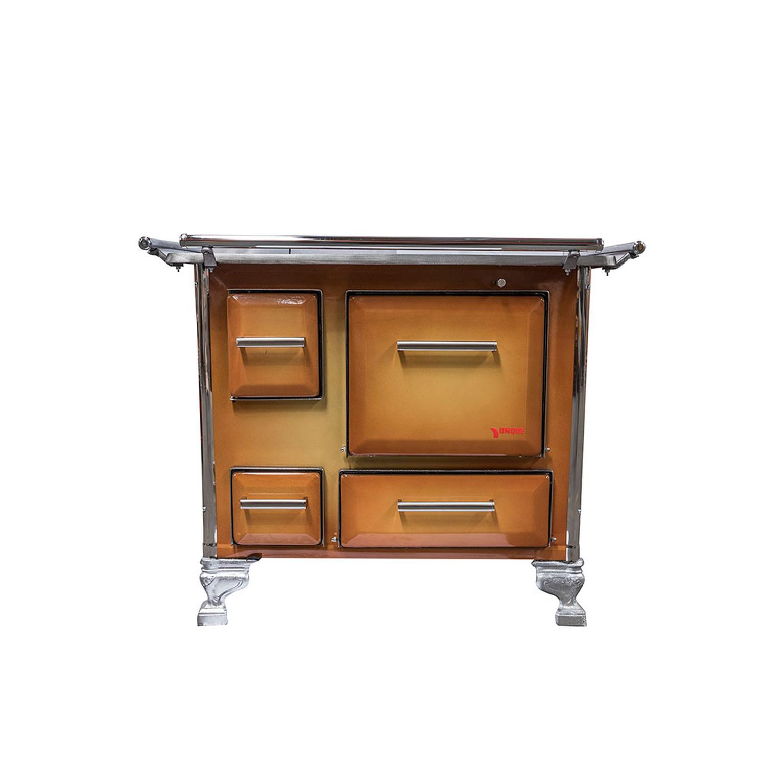 Cocina a leña, enlozada, amplio horno enlozado, cubierta desmontable, manillas tradicionales y baranda cromadas.