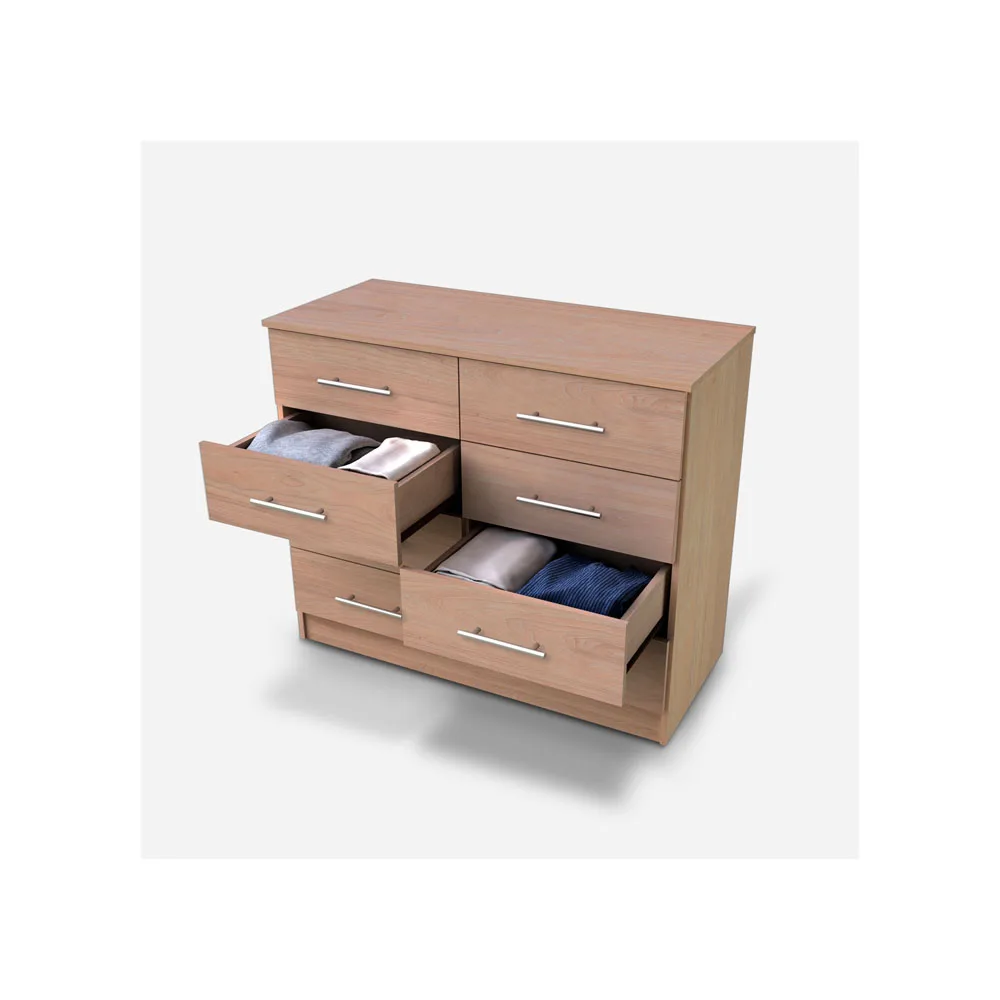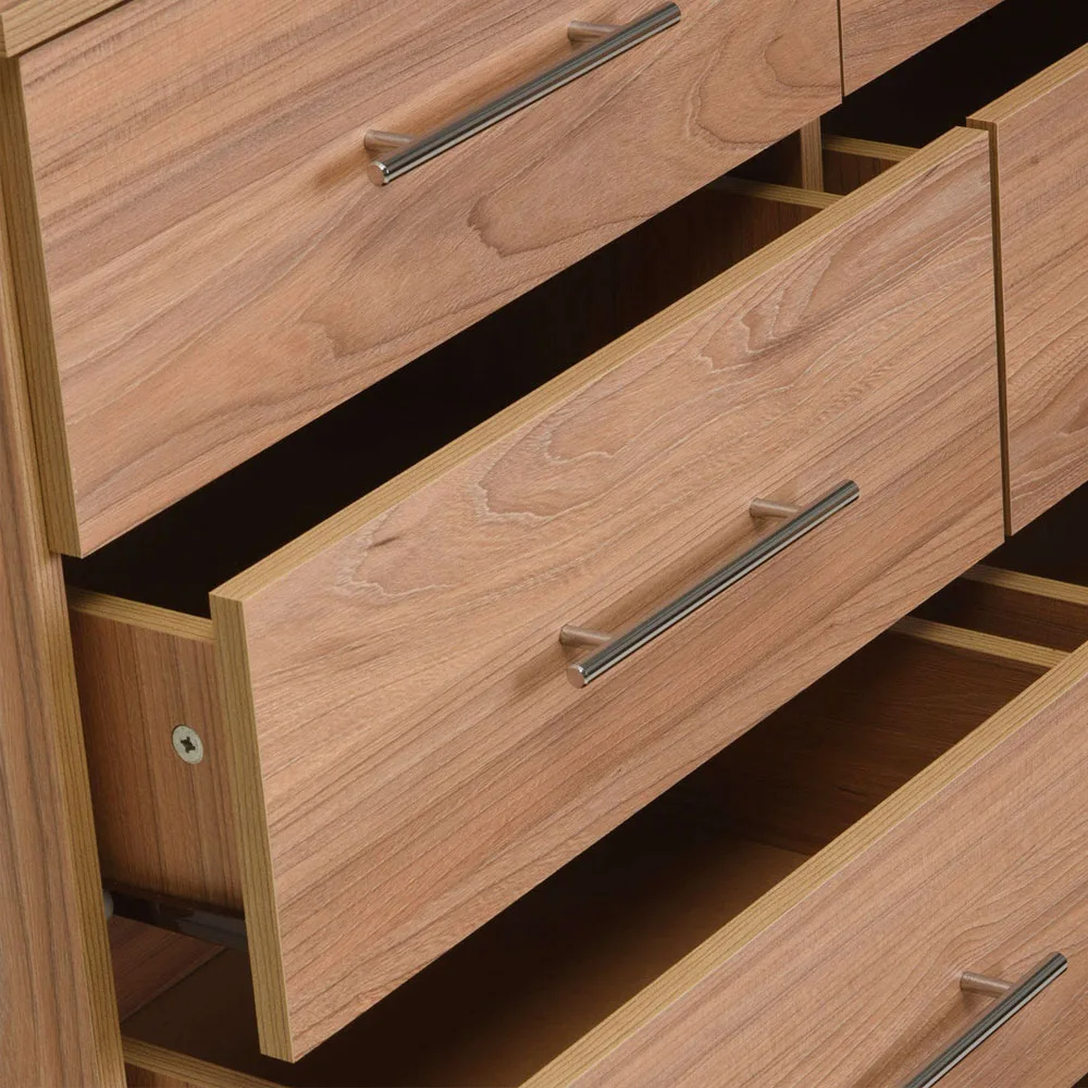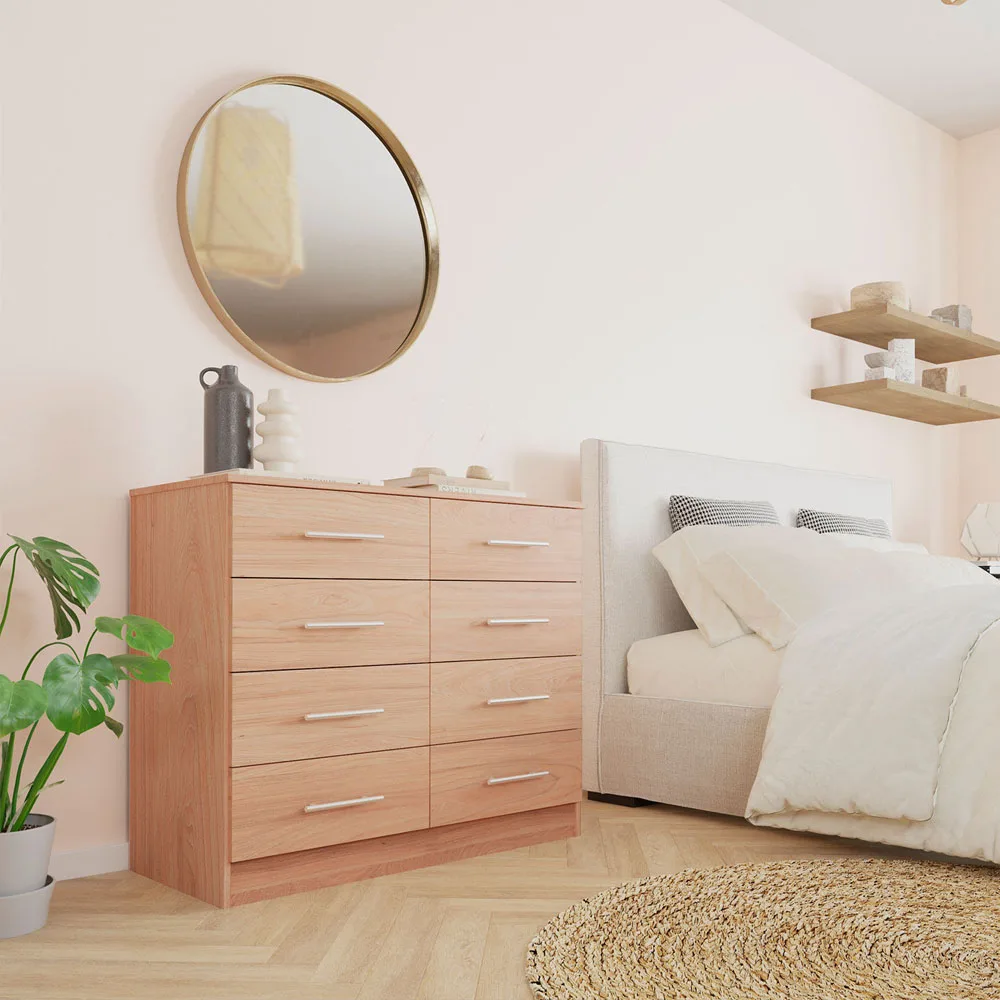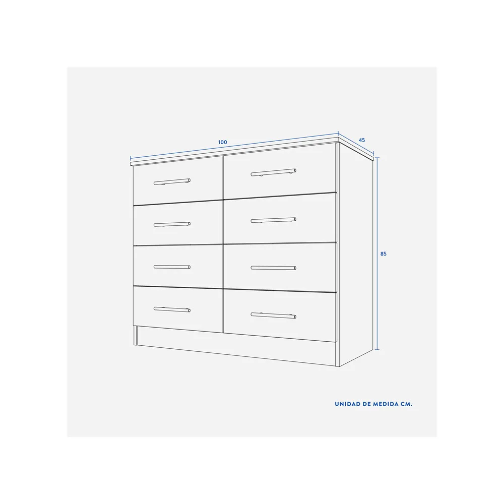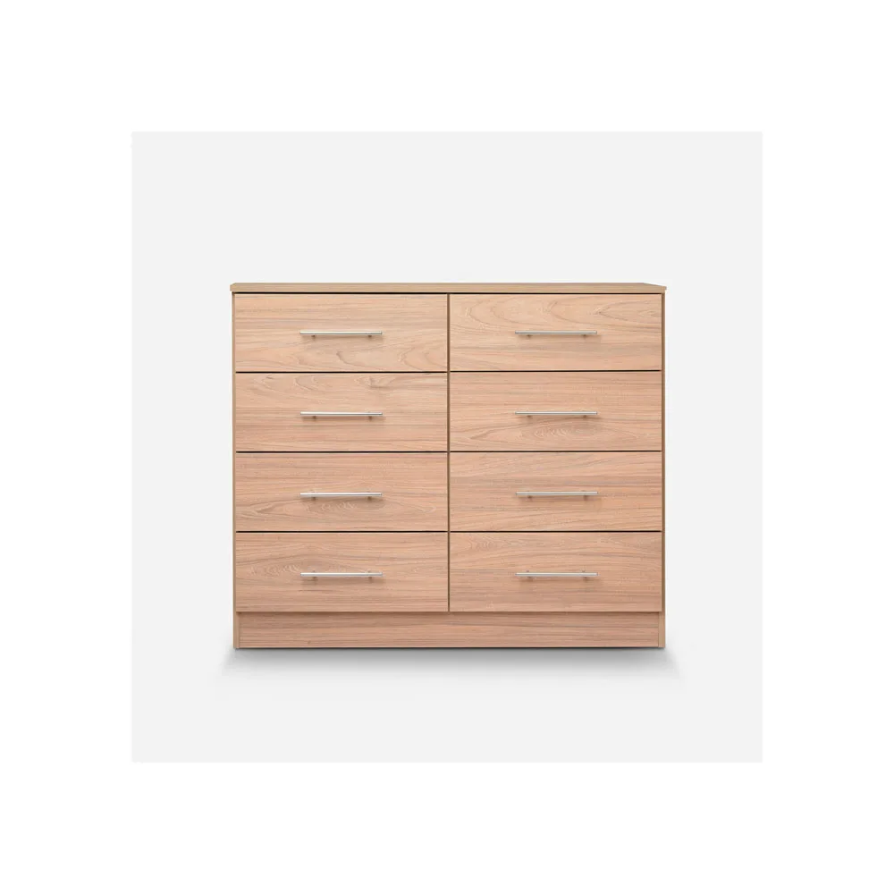 La cómoda Polux olmo de CIC ofrece una solución de almacenamiento generosa, con un diseño limpio y de líneas rectas que se adapta a distintos estilos decorativos. Con ocho cajones de fácil acceso, es perfecta para mantener todo en orden sin perder estilo.
