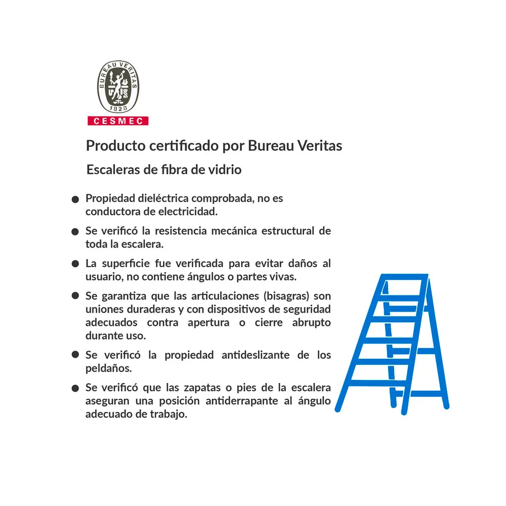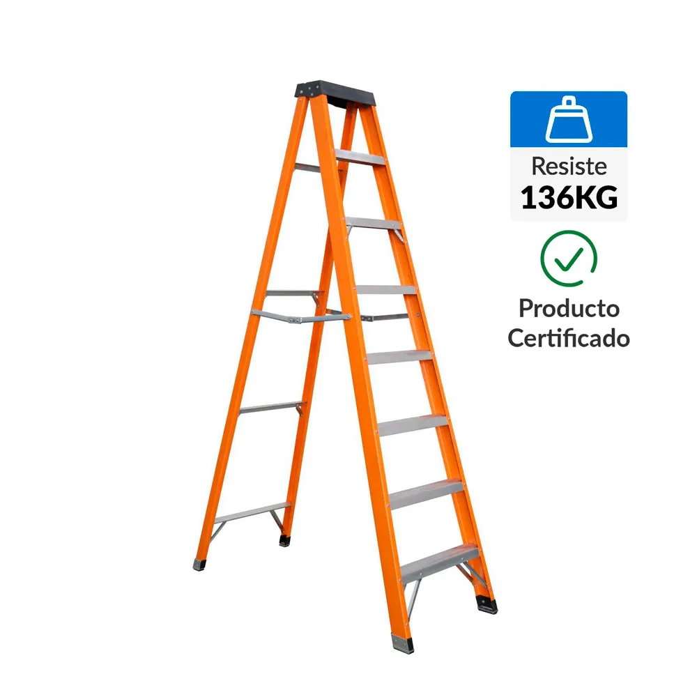 | Características | Tapa superior con pintura y soporte de herramientas. Rieles laterales no conductores, aptos para usar alrededor de la electricidad. Escalón antideslizante. Almohadilla para pies antideslizante. |