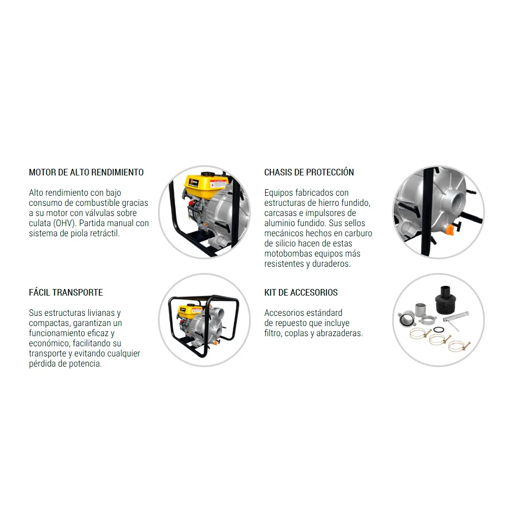 Motobomba a gasolina semi profesional 3”x 3” Trash centrífuga. Fiable, eficiente y robusta. Diseñada para proveer de agua donde usted lo necesite. Equipos de fácil mantención y bajo consumo de combustible. Motor con sensor de aceite.