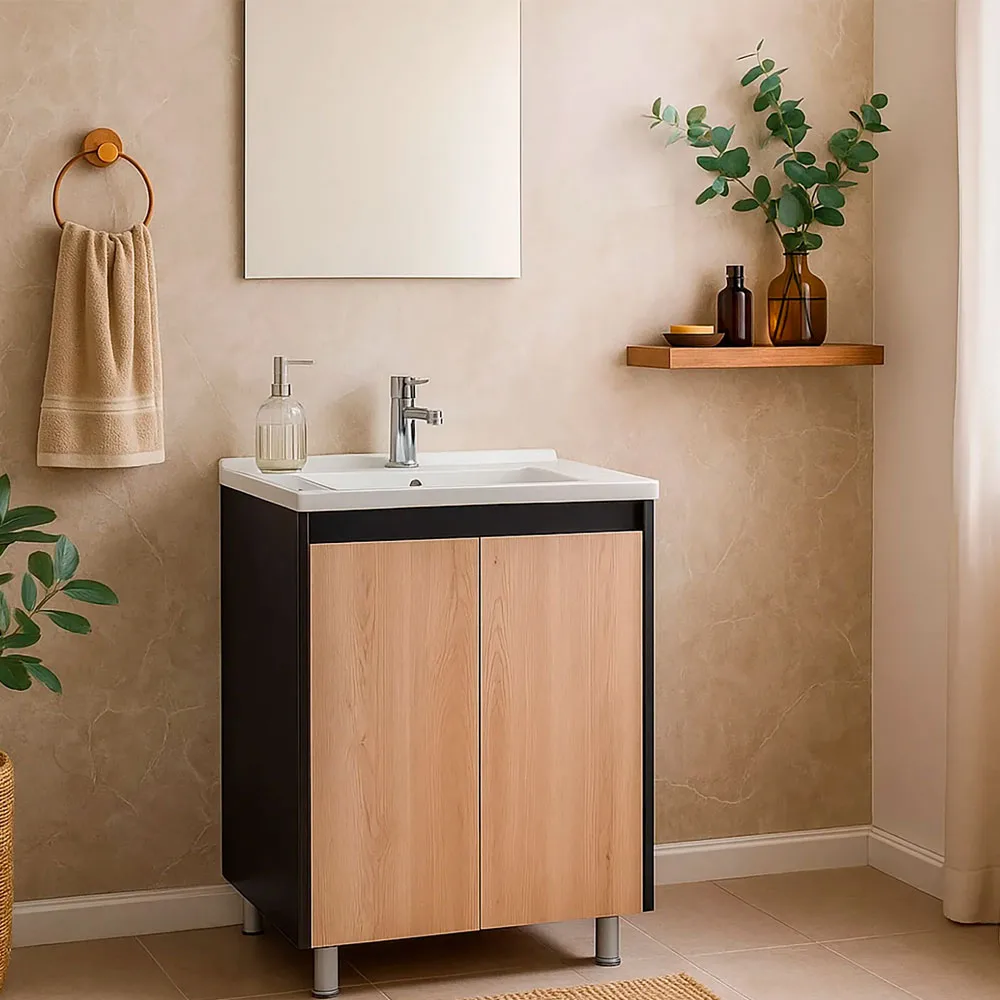 | Caracter铆sticas | Mueble con lavamanos cer谩mico a piso de 60x47x85 cm (patas de 10 cm) y espejo de 60x50cm |
