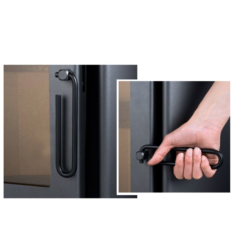 Esta tecnología permite que siempre tengas una visión clara de las llamas, creando una atmósfera agradable y elegante, mientras que te facilita la limpieza y el mantenimiento de la estufa. Además, su sistema de seguridad cuenta con una manilla fría, lo que garantiza un uso seguro al abrir y cerrar la puerta del aparato.