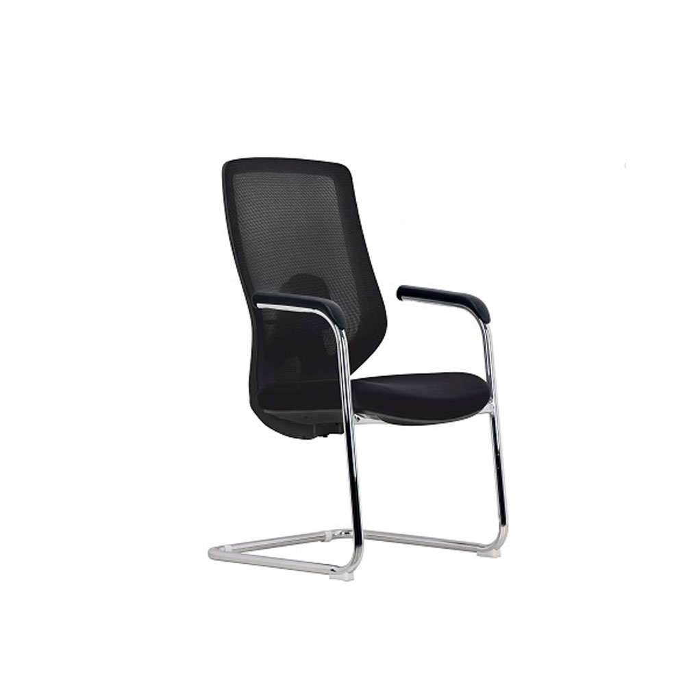 SILLA VISITA MODELO JUN TRINEO, ESTRUCTURA METALICA CROMADA, ASIENTO TAPICERIA CON ESPUMA DE ALTA DENSIDAD TAPIZ COLOR NEGRO. APOYABRAZOS COLOR NEGRO CON CUBIERTA BLANDA PU. APOYO LUMBAR CON REGULACION DE ALTURA Y DETALLE COLOR ROJO INCORPORADO.