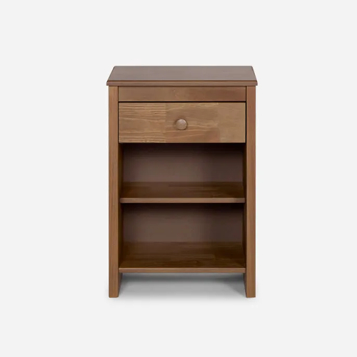 Contar con un velador puede resultar indispensable a la hora de armar un dormitorio. Por eso, el Velador Ferrara te encantará, ya que podrás apoyar una lámpara o reloj, guardar en su cajón (sin rieles metálicos) lo que necesites tener cerca de tu cama, y también apoyar zapatillas de levantarse o lo que estimes necesario en los espacios o repisa que hay bajo el cajón. Velador posee cajón con tope para la apertura del cajón. Cuenta además con una repisa que optimiza el espacio donde almacenar y un panel trasero completo, que evita que lo que almacenas se caiga por detrás del mueble, además de hacer tu velador más firme.El Velador Ferrara de madera de pino es resistente, y su color chocolate es muy fácil de combinar y otorga una apariencia cálida y armoniosa.